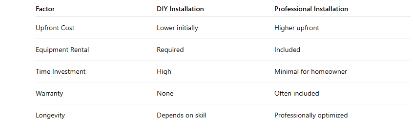 DIY installation may reduce initial expenses, but professional installation delivers long-term value, structural integrity, and peace of mind.