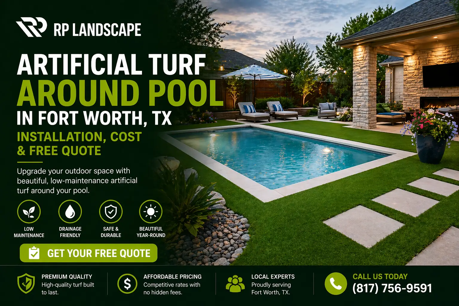 Call us at (817) 756-9591 or fill out the request form at rp-landscape.com. We'll schedule a free on-site visit, assess your pool surround, and provide a transparent written estimate the same day, no obligation required.